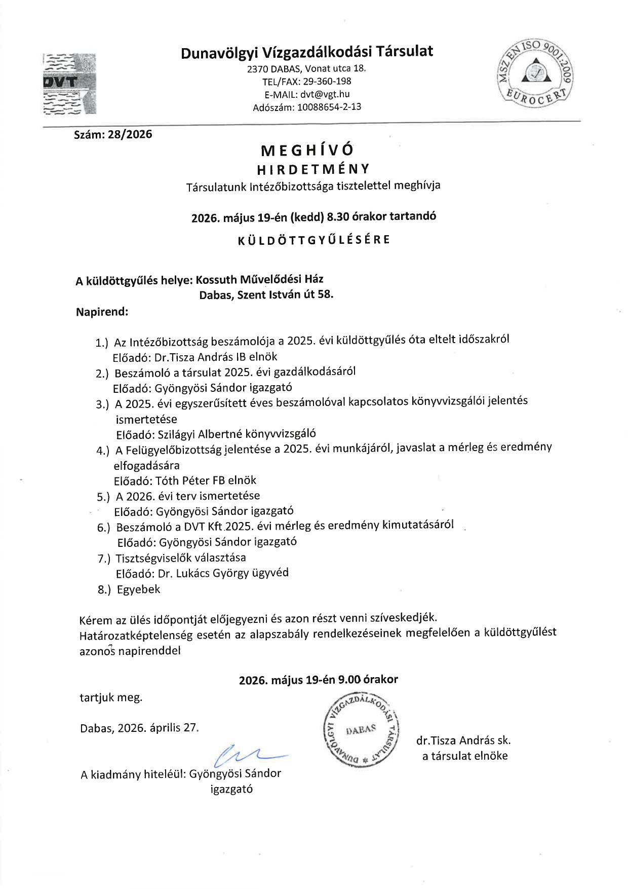Meghívó küldöttgyűlésre Dunavölgyi Vízgazdálkodási Társulat